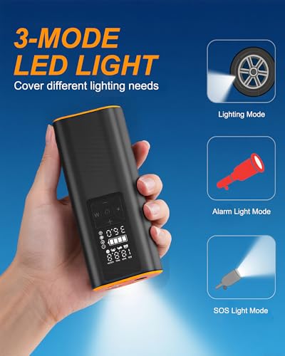 4-MODE LCD DISPLAY:The Air Compressor’s digital LCD screen clearly displays readings in PSI, Bar, kPa, KG units, with four smart presets for cars, motorcycles, bicycles, and balls. A triple-mode LED light (lighting/warning/SOS) enhances visibility and safety in all conditions, suitable for day and night use.