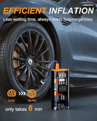 150PSI HIGH-SPEED INFLATION PERFORMANCE:150PSI high-power portable air compressor rapidly inflates a car tire (0-36PSI) in approximately 6 minutes, a motorcycle/bicycle tire in 1.5 minutes, and a basketball in 35 seconds. This efficient Air Pump features a professional-grade motor for fast performance, ideal for roadside emergencies, routine maintenance, and sports equipment preparation.