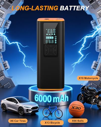 LONG-LASTING BATTERY LIFE:Equipped with a 6000mAh high-capacity lithium battery, this portable air compressor supports inflating up to 4 car tires, 10 motorcycle tires, 13 bicycle tires, or 66 basketballs on a single charge. Compact and lightweight (8.8×3.5 inches, 1.2 lbs), it eliminates range anxiety—perfect for road trips, camping, and emergency preparedness.