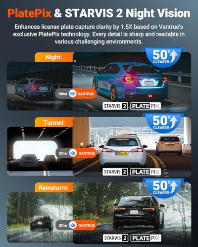 [Exclusive PlatePix + STARVIS 2 + HDR/IR Night Vision] Experience unparalleled night vision clarity with advanced STARVIS 2 and HDR technology across dash cam front and rear inside. The front car camera integrates Vantrue’s exclusive PlatePix technology, boosting license plate recognition by 1.5X for undisputable evidence. The car cameras’ s 4 IR lights deliver crystal-clear cabin footage even indark night, perfectly meeting the needs of late-night driving.