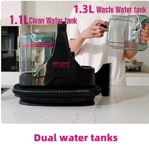 Specification: WECLEAN C3 Portable Carpet Cleaner Machine for Car, Stairs, Sofa with 18Kpa Suction and 600W Motor, Dual-Tank Spot Cleaner with 3 Brushes, Handheld Carpet and Upholstery Cleaner Black and Pink