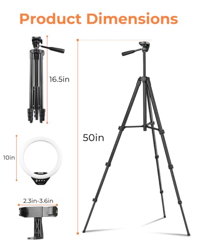 Specification: Sensyne 10” Ring Light with 50” Extendable Tripod Stand, LED Circle Lights with Phone Holder for Live Stream/Makeup/YouTube Video/TikTok, Compatible with All Phones