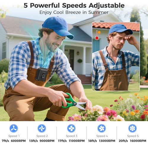 【5 Powerful Speeds】Equipped with a high-speed turbine motor, COMLIFE waist fan offers 5 adjustable speeds with a maximum rotation speed of 16000 RPM and wind speed up to 20 ft/s. Whether you’re working on a hot jobsite or cycling under the sun, it delivers instant cooling relief