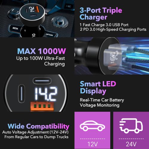 Specification: OLG 100W Car Charger – 3 Port Cargador para Carro (LED Display, 12V/24V Compatible) – Cigarette Lighter USB Fast Charge Adapter for iPhone, Android, Type V
