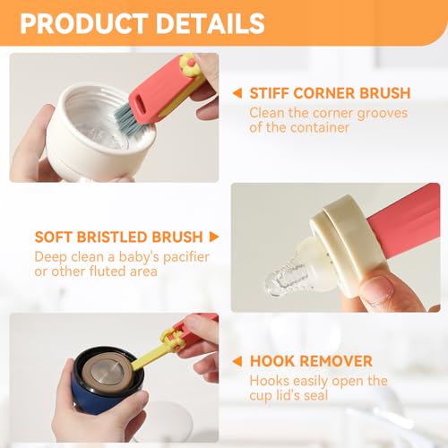 【 3 in 1 Cleaning Brush】3 in 1 bottle brush with a hook remover, stranded slit brush and stiff bristle corner brush, makes easier to clean coffe cups or mechine, tea cups, milk bottles, ice grids, molds, peelers, etc.