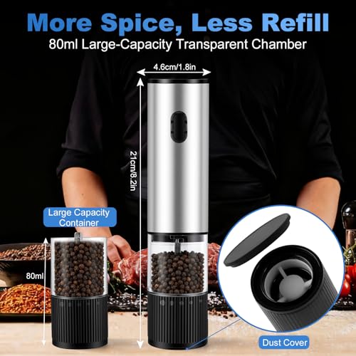Versatile Spice Grinder for Any Occasion: Wide Use For Many Spices, suitable for home kitchens, restaurants, gatherings, camping, or picnics. It handles white and black pepper, sea salt, Himalayan salt, rosemary, cumin, red pepper, and more. The electric salt and pepper grinder adapts easily to indoor and outdoor use while preserving natural spice flavor
