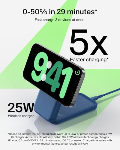 **Based on internal testing. Belkin Qi2 25W wireless technology charges iPhone 16 from 0-50% in 29 minutes using iOS 26 or newer. Charge time varies with environmental factors; actual results will vary.