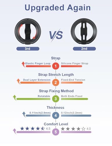 Comfortable Elastic Phone Grip: This strap features a more comfortable and highly stretchable, high-elastic strap. With its extended length, it greatly reduces the pressure on the fingers when using the strap. The strap is fixed on a rotatable inner ring, allowing you to easily adjust your phone to the most comfortable angle while using the grip.