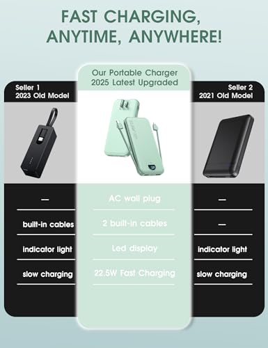 Specification: Portable Power Bank, 12000mAh 22.5W Phone Charger with Built-in Cables and Wall Plug, USB C Fast Charging Battery Bank with Smart LED Display, External Battery Pack for iPhone, iPad, Samsung etc Green