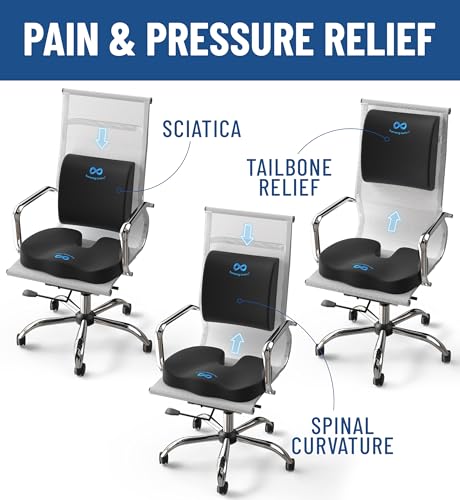 ERGONOMIC GEL INFUSED SEAT CUSHION SET: This dual cushion set includes a gel-infused memory foam seat cushion and lumbar support pillow for complete comfort at home, in the office, or while driving. Designed to reduce pressure on your tailbone and back, it encourages proper posture and spine alignment. Ideal as an office chair cushion, car seat pillow, or desk accessory for travel, or gaming sessions. The lumbar support pillow and seat cushion provide full body support for your 8 hour workday