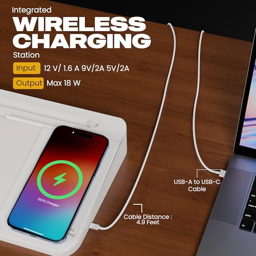 Wireless Charging: The built-in 18W wireless charger is designed for fast charging with compatible devices. An included adhesive bumper helps smaller phones (typically under 6 inches in height or with smaller wireless charging coils) sit higher on the charging pad, ensuring proper alignment with the center for efficient charging. The phone’s wireless charging coil must align with the center of the pad for optimal results. Please note that charging speed may vary based on your phone’s charging capabilities and compatibility with fast charge technology. For best performance, ensure your device supports 18W wireless charging and is positioned correctly on the pad.