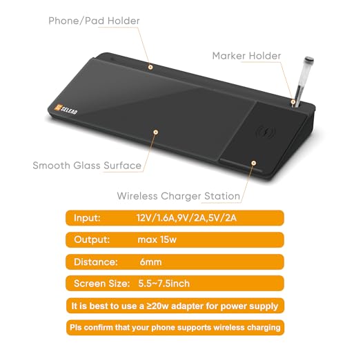 Specification: SELEAD Desktop Glass Whiteboard with Wireless Charger Station, Dry Erase Board Computer Pad Keyboard Stand with Organizer for Home, School, Office Desk Accessories, Black